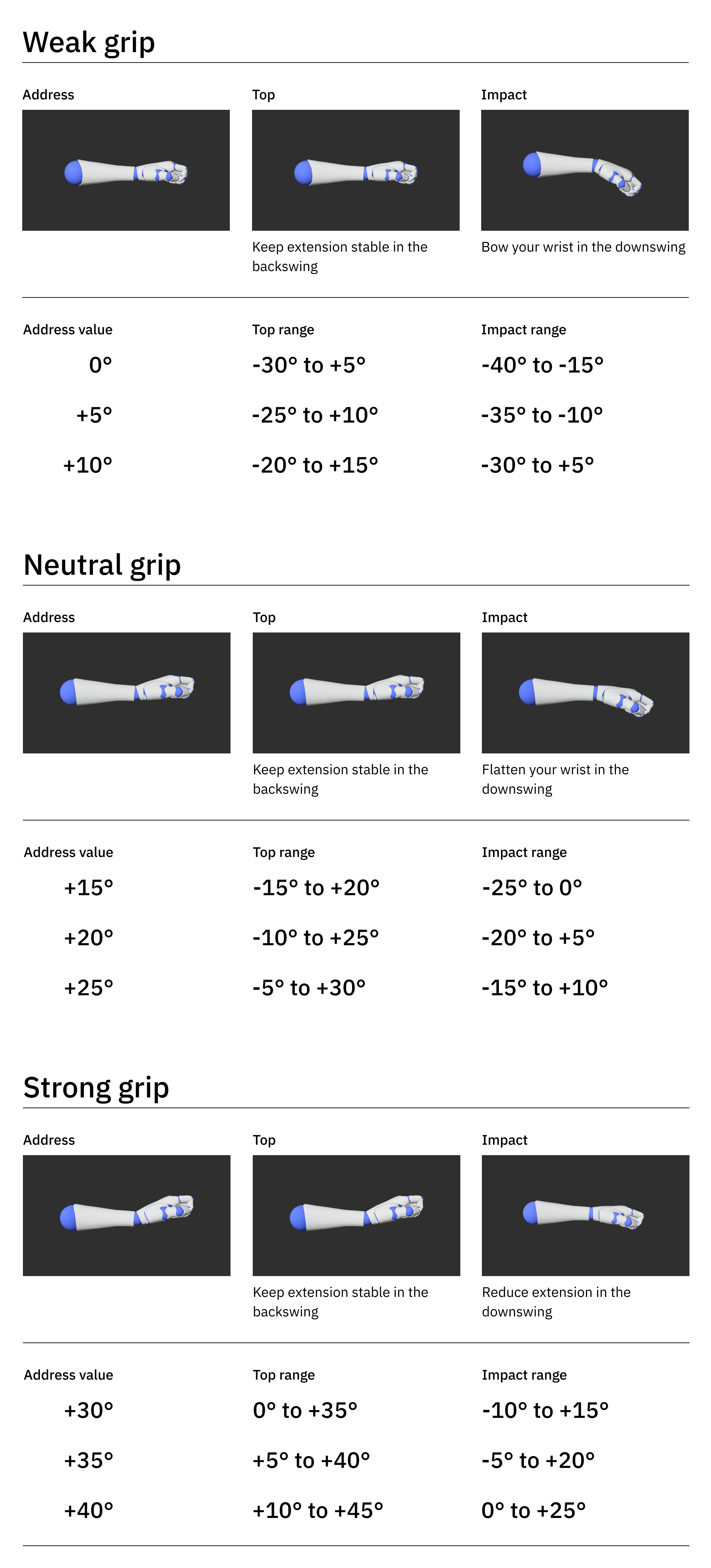 The grip also significantly influences your wrist angle positions from Address to Top and all the way to Impact. To comprehend the lead wrist target ranges at each of the positions for Pattern A players, please refer to the table provided below.